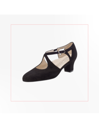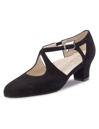 Les chaussures de danse Werner Kern, modèle Gala sont entièrement faites en daim noir avec une boucle en argent sans nickel. La double lanière croisée à l'avant du pied et le petit talon de 3.4 cm garantissent stabilité et maintien. Cette paire est idéale pour toutes les danses de salon (latine et standard) ou danses swing et est convient aux pieds larges.