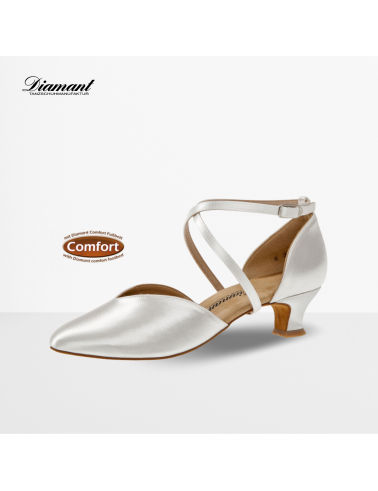 Chaussures de danse idéales pour un mariage, matière en satin blanc. Modèle pour femme à talons de la marque Diamant avec talon de 4,2 cm.