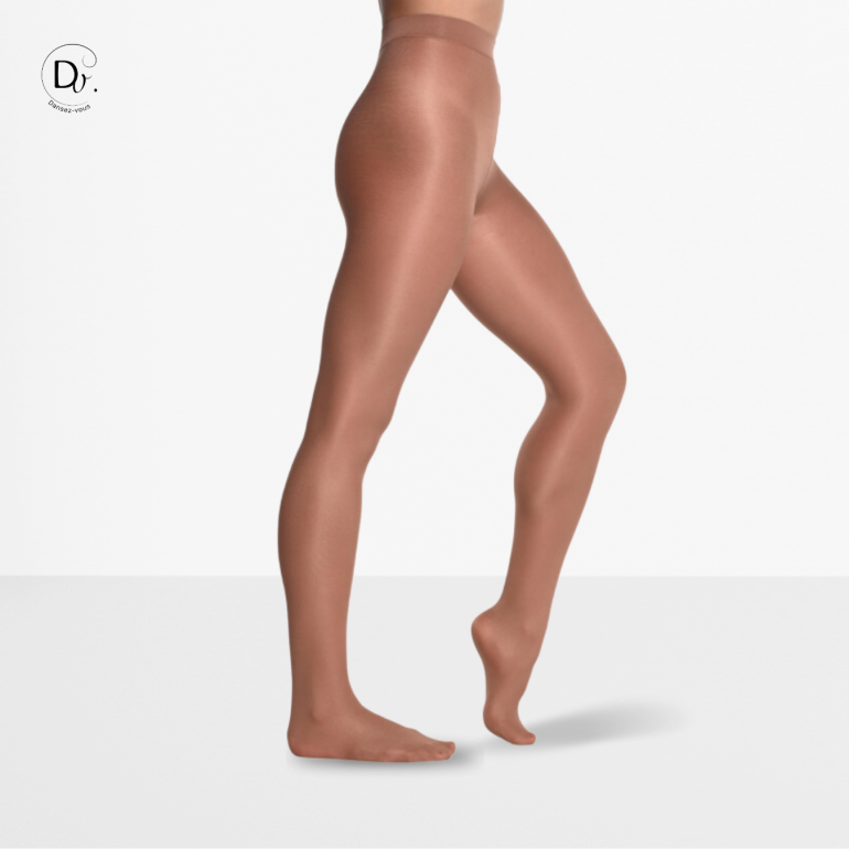 Collants de danse brillants de la marque Dansez-Vous. Les collants brillants avec pieds sont idéals pour les compétitions de danse grâce à leurs reflets qui mettent en valeur le galbe de la jambe.